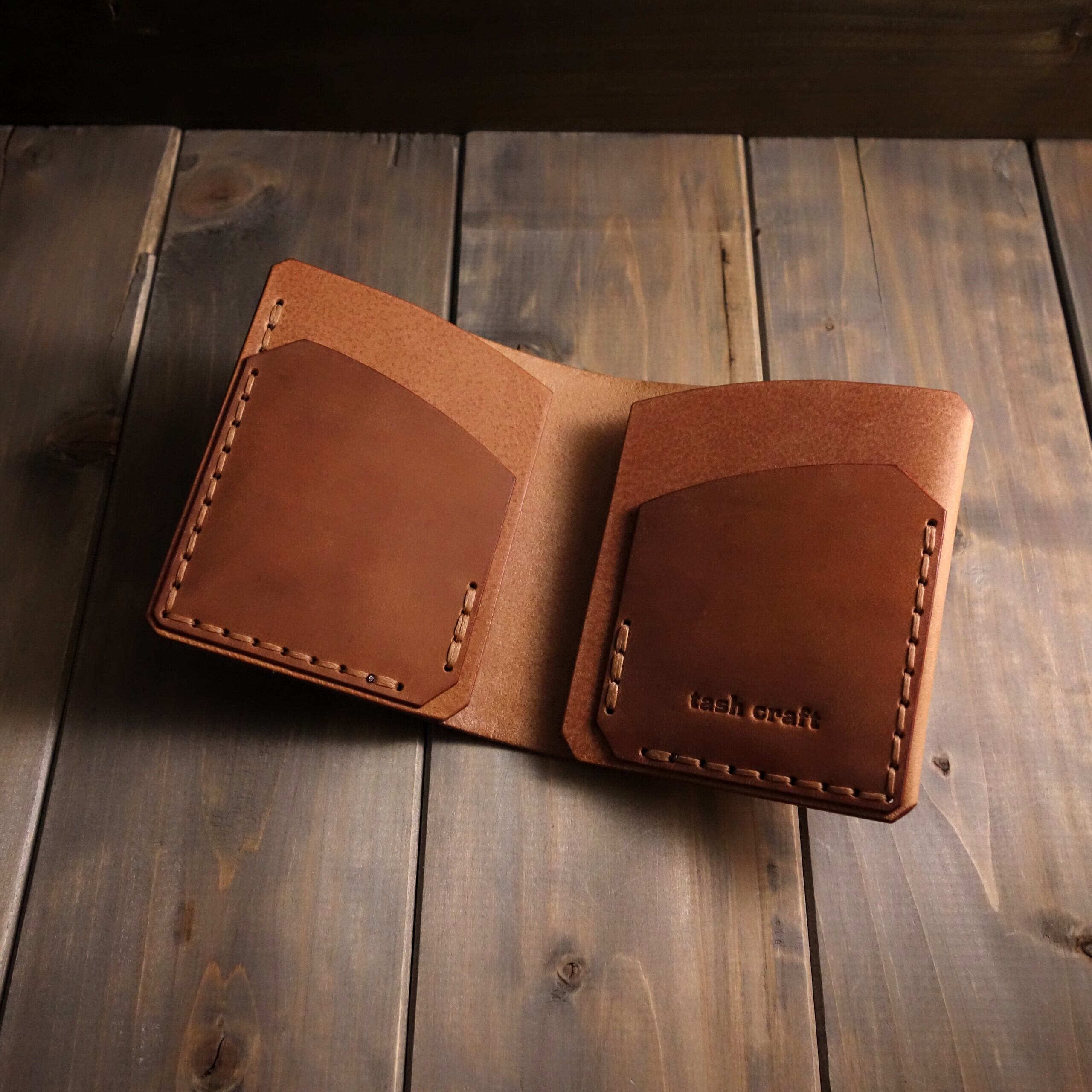 Only the right side has the outer leather folded back when opened, allowing bills to be inserted right to the edge, contributing to a smaller size.
