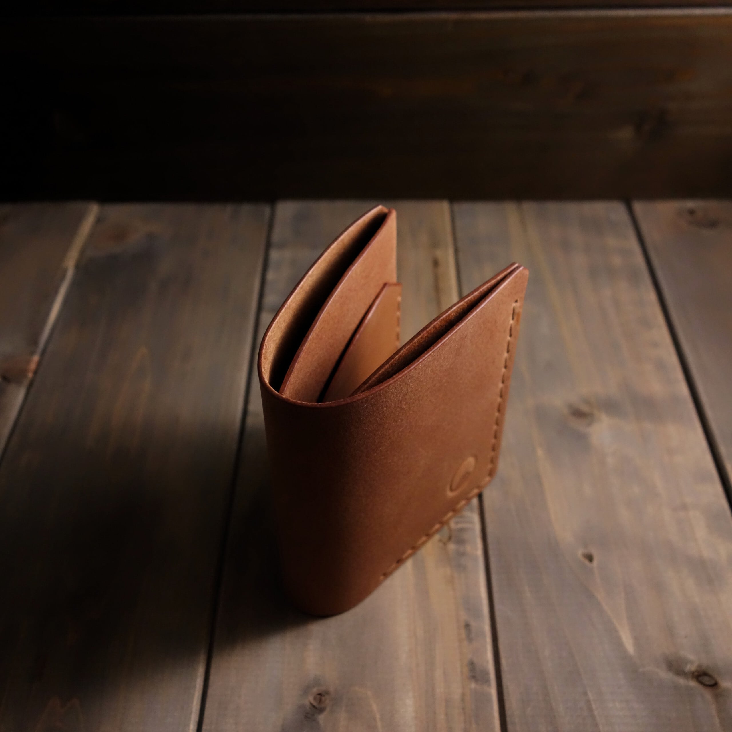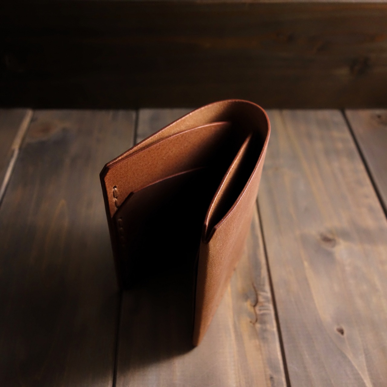 開いて右側のみ表革を折り返してあるので、札を縁ギリギリまで挿入できてサイズダウンに繋がっています。
